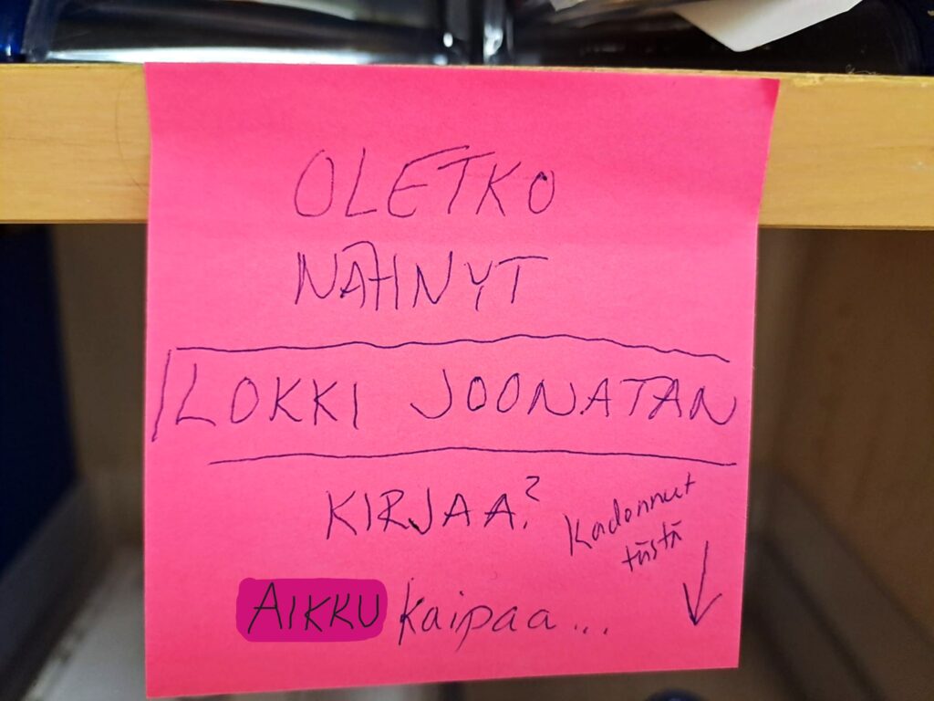 En myöhästyisi kuin ihan vähän. Tietysti läppärin laturi oli hukassa, mutta ehkä se jaksas sen tunnin. Syödä en ehtisi, mutta jos äitillä olis autossa joku patukka. Tungin tavarat kassiin ja kaivoin toppatakin taskusta puhelinta. Puhelimen lisäksi taskussa oli jotain muuta. Ei vittu. Näpyttelin äitin numeron.
